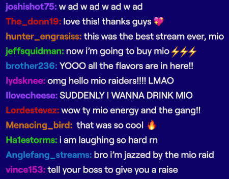 You type !hydrate in chat, streamers drink. We saw an opportunity. So, we joined unsuspecting streams and reminded streamers to !hydrate. Just like mio adds energy to water, we brought energy to streams the instant streamers drank. We used Twitch’s raid feature, which instantly sends the audience of one stream to another, to deliver dozens of unique mio accounts to streams, bringing them exactly what they want most: bigger audiences and high energy chats. We hyped up streamers and gamers, gave away Twitch subscriptions to viewers, and became the subject of conversation for thousands of Twitch users.
